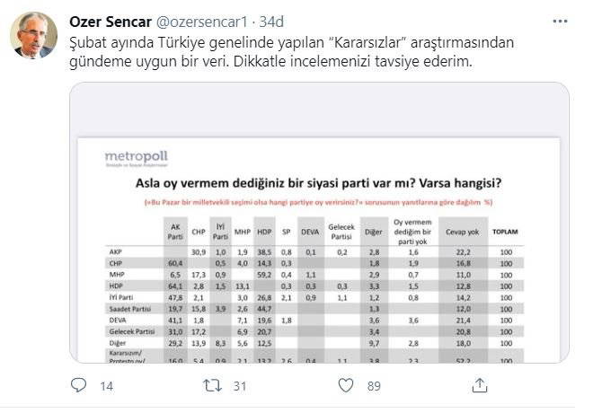 MetroPOLL Araştırma Şirketi kurucusu Özer Sencar'ın paylaştığı anket sonuçlarına göre, CHP'li seçmenin yüzde 60,4'ü "AKP'ye oy vermem" derken, İYİ Partili seçmenin yüzde 47,8'i AKP'ye oy vermeyeceği açıklandı.