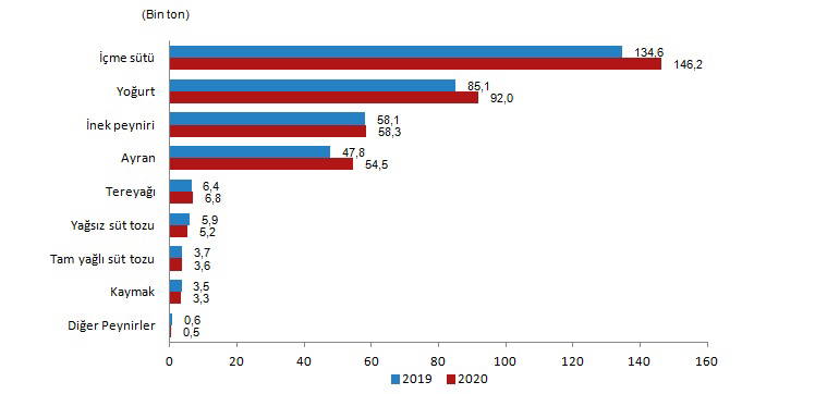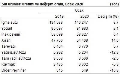 Ocak ayında bir önceki yılın aynı ayına göre ayran üretimi yüzde 14 artışla 54 bin 468 tona, tereyağı üretimi yüzde 5.7 artarak 6 bin 770 tona, inek peyniri üretimi yüzde 0.4 artarak 58 bin 327 tona yükseldi.