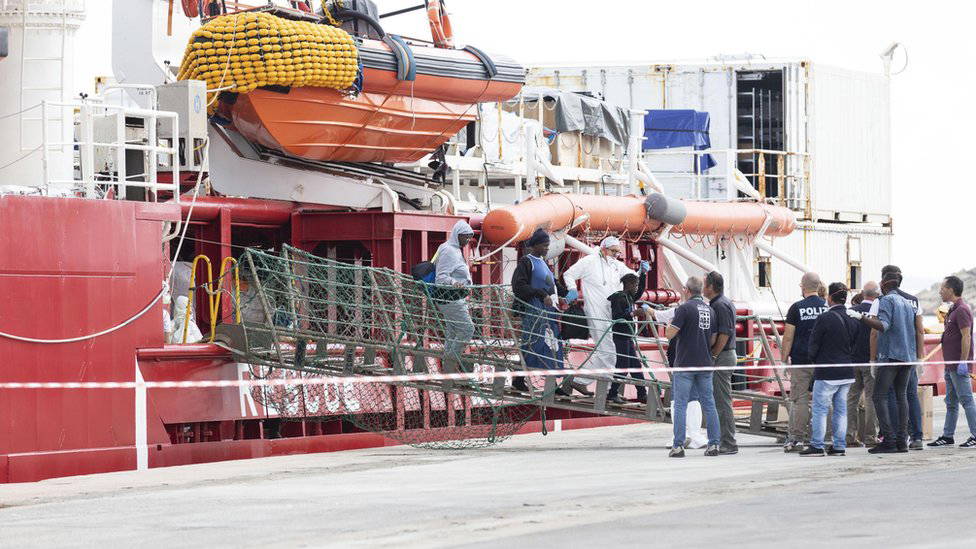 Yardım gemisi Ocean Viking tarafından Akdeniz'de kurtarılmalarının ardından limana yanaşmalarına izin verilmemesi nedeniyle 12 gündür denizde bekletilen 104 göçmen sonunda bu sabah İtalya'ya getirildi.