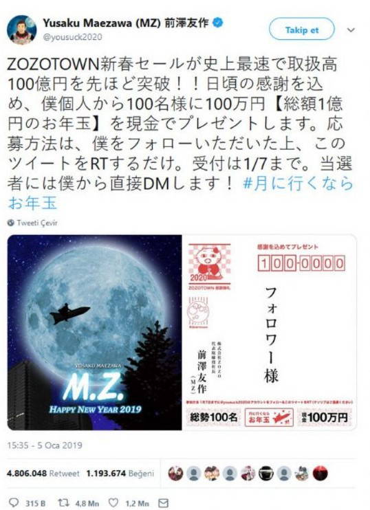 BBC'de yer alan habere göre internet üzerinden kıyafet satışı yapan Zozotown'ın kurucusu Maezawa, 5 Ocak'taki Twitter mesajını paylaşacak kişiler arasında çekilişle belirlenecek 100 talihliye toplam 10 milyon Japon Yen'i (yaklaşık 925 bin dolar) vadetti.