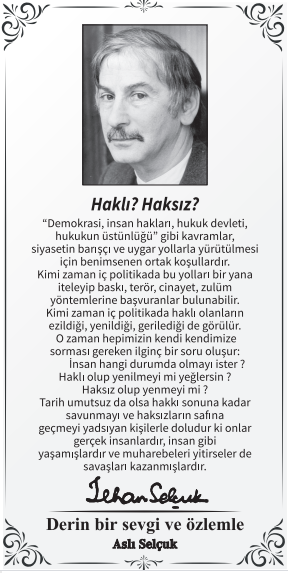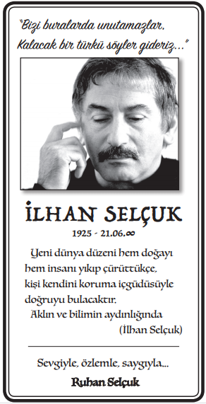İşte Selçuk’lar, insanlığın geleceği ile uygarlığın sonu arasındaki o kavşakta, sorumluluk alıp insanın geleceğine yatırdılar tüm uğraşlarını, itaatsizlik zırhını kuşanarak. Bugün baktığımızda görüyoruz ki o gelecek, bizim de geleceğimizdir, o geleceği sahipleniyoruz, sahipleneceğiz de... Turhan Selçuk ve İlhan Selçuk’u ölüm almadı, alamadı bizlerden, ama inanç eksikliğimiz alabilir bizlerden. Ne olur o vakit?