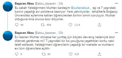 "Bu sabah Yeldeğirmeni Muhtarı kardeşim @sultanaksuk, eşi ve 7 yaşındaki kızının yaşadığı evi polislerce basılıyor. Yere yatırılıyorlar, tehditlerle Boğaziçi Üniversitesi eylemine katılan öğrencilerden birinin ismini soruluyor. Muhtar olduğuna ikna olunca özür diliyorlar.