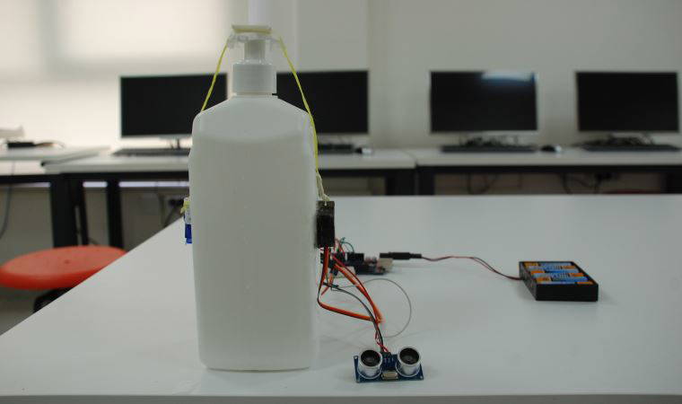 “Projemiz mesafe sensörü ile çalışıyor. Mesafe sensörü, belli bir değer aralığında belli bir mesafede bir nesne veya bir uzaklık gördüğü zaman, motorlara komut veriliyor. Sonrasında 90 derecelik açıyla basınç uygulanıyor ve dezenfektanın butonu basılmış oluyor. Bu sayede elimize dokunmadan dezenfektan gelmiş oluyor...”
