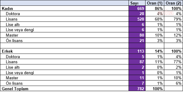 Ankete katılan kadınların yüzde 49’u fiziksel şiddete maruz kaldıklarını beyan etti. Fiziksel şiddete maruz kaldığını belirten kadınların yüzde 35’i ise şiddet uygulayıcısıyla ilgili soruya 'eşim/birlikte yaşadığım kişi', yüzde 34’ü 'babam' yanıtı verdi. Ayrıca ankete katılan kadınların yüzde 61’i mobbing’e maruz kaldığını ifade etti.
