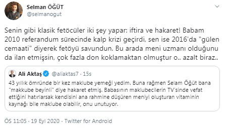 Selman Öğüt, Aktaş'ın bu paylaşımına seviyeyi daha da düşürerek yanıt verdi. Öğüt, Aktaş'ın sözlerini alıntıladığı paylaşımında "Senin gibi klasik fetöcüler iki şey yapar: iftira ve hakaret! Babam 2010 referandum sürecinde kalp krizi geçirdi, sen ise 2016'da "gülen cemaati" diyerek fetöyü savundun. Bu arada meni uzmanı olduğunu da ilan etmişsin, çok fazla don koklamaktan olmuştur o.. azalt biraz.." dedi.