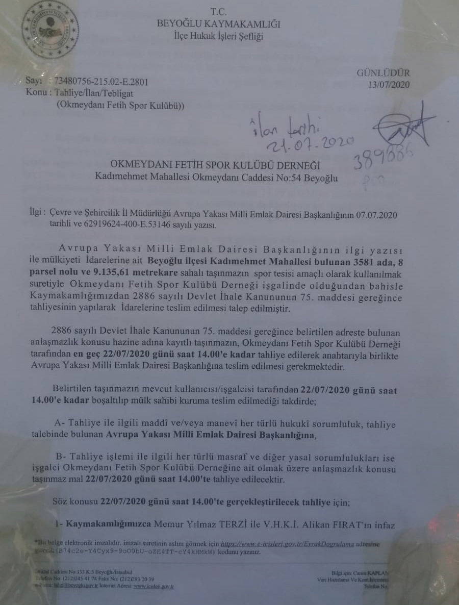 Ancak 20 Temmuz 2020’de Çevre ve Şehircilik Bakanlığı adına kulübe tebligat gönderen Beyoğlu Kaymakamlığı, kulübün tesisleri iki gün içinde boşaltmasını istiyor.