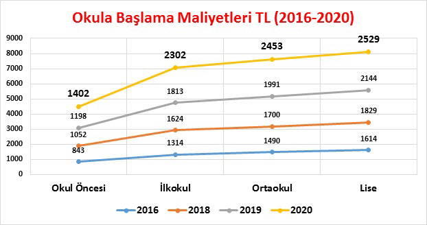 Giderde, 2019’a oranla yüzde 17,09 artış oldu. İlkokul 1. sınıfa başlayan bir öğrencinin başlangıç gideri ise 2 bin 302 lira 44 kuruş olarak hesaplandı. 2019’a göre artış ise yüzde 26,99. Ortaokula başlayan bir öğrencinin başlangıç gideri de 2 bin 453 lira 17 kuruş oldu. 2019’a oranla artış yüzde 23,21 olarak gerçekleşti. Liseye başlayan öğrencinin ise okula başlangıç gideri 2 bin 529 lira 38 kuruş olarak tespit edildi. 2019’a göre artış yüzde 17,97 oldu. Tüm eğitim kademelerindeki ortalama artış ise yüzde 21,31 olarak gerçekleşti.