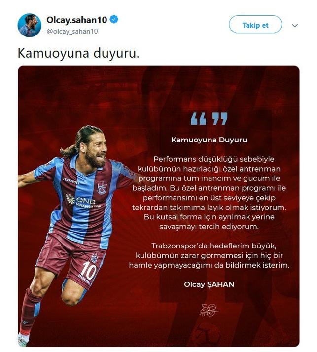 Trabzonspor'da satış listesine konulan Olcay Şahan, kendisine ait sosyal medya hesabından açıklamada bulundu. Olcay, "Performans düşüklüğü sebebiyle kulübümün hazırladığı özel antrenman programına tüm inancım ve gücüm ile başladım. Bu özel antrenman programı ile performansımı en üst seviyeye çekip tekrardan takımıma layık olmak istiyorum. Bu kutsal forma için ayrılmak yerine savaşmayı tercih ediyorum. Trabzonspor’da hedeflerim büyük, kulübümün zarar görmemesi için hiç bir hamle yapmayacağımı bildirmek isterim" ifadelerini kullandı.