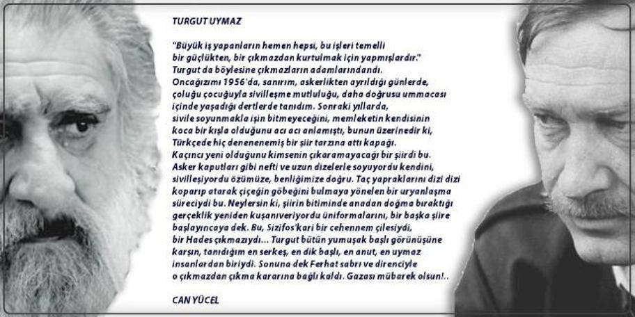Can Yücel gibi bu yazımıza konu, şairlikte ve insanlıkta usta, silinmez izler bırakmış Turgut Uyar da Ağustos’ta kaybettiğimiz ölümsüz şairimiz. Sözü, Can Yücel’in, Argos Yeryüzü Kültürü Dergisi’nin Ağustos 1989’daki 12’inci sayısında Turgut Uyar için kaleme aldığı “Turgut Uymaz” adlı yazısıyla devam ederek getirelim ustaya.