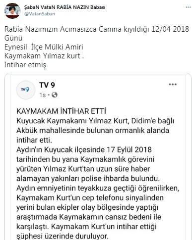 11 yaşındaki Rabia Naz Vatan'ın şüpheli ölümü sırasında Giresun'un Eynesil ilçesinde kaymakam olan Aydın'ın Kuyucak İlçe Kaymakamı Yılmaz Kurt otomobilinde ölü bulundu.