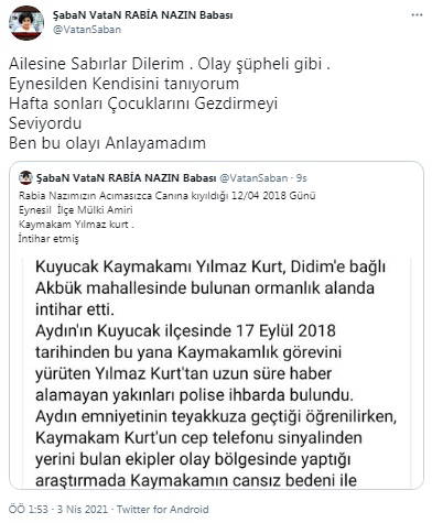 Rabia Naz Vatan'ın babası Şaban Vatan, Kaymakam Kurt'un yaşamını kaybettiğine ilişkin haberi Twitter hesabından "Rabia Nazımızın acımasızca canına kıyıldığı 12 Nisan 2018 günü Eynesil ilçe mülki amiri Kaymakam Yılmaz Kurt intihar etmiş. Ailesine sabırlar dilerim. Olay şüpheli gibi. Eynesil'den kendisini tanıyorum. Hafta sonları çocuklarını gezdirmeyi seviyordu. Ben bu olayı anlayamadım" ifadeleriyle paylaştı.