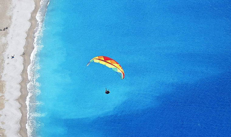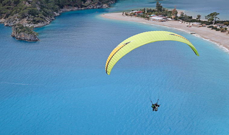 Yamaç paraşütü pilotlarının hazırlıklarının ardından pistlerden havalanan tatilciler, karlı Babadağ ve Ölüdeniz'in etkileyici manzarasını kuş bakışı izleme fırsatı buluyor.