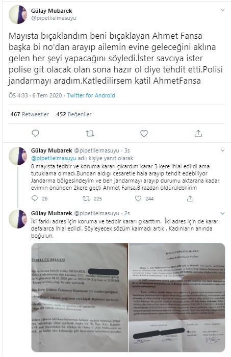 ‘Birazdan öldürülebilirim’ diyen Mubarek, şu ifadeleri kullandı; “Mayıs’ta bıçaklandım. Beni bıçaklayan Ahmet Fansa başka bir no’dan arayıp ailemin evine geleceğini aklına gelen her şeyi yapacağını söyledi. ‘İster savcıya ister polise git, olacak olan sona hazır ol’ diye tehdit etti. Polisi, jandarmayı aradım.Katledilirsem katil Ahmet Fansa. 8 Mayısta tedbir ve koruma kararı çıkardım. Karar 3 kere ihlal edildi ama tutuklama olmadı. Bundan aldığı cesaretle hâlâ arayıp tehdit edebiliyor.Jandarma bölgesindeyim ve ben jandarmayı arayıp durumu aktarana kadar evimin önünden 2 kere geçti Ahmet Fansa. Birazdan öldürülebilirim. İki farklı adres için koruma ve tedbir kararı çıkarttım. İki adres için de karar defalarca ihlal edildi. Söyleyecek sözüm kalmadı artık. Kadınların ahında boğulun.”
