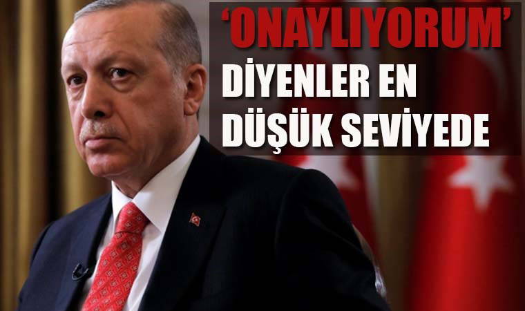 T24'ün aktardığı habere göre Erdoğan'a görev onayı verenlerin oranı düşüş eğilimi gösterirken, 'Onaylıyorum' diyenlerin oranının Ekim 2018'den bu yana en düşük seviyede olması dikkati çekti.
