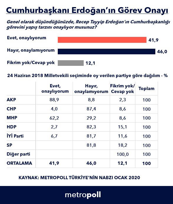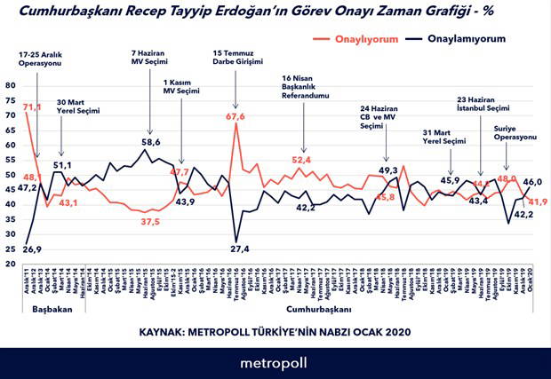 Metropoll araştırma şirketinin "Türkiye'nin Nabzı Ocak 2020: Cumhurbaşkanı Recep Tayyip Erdoğan’ın Görev Onayı" anketine göre, AKP Genel Başkanı ve Cumhurbaşkanı Recep Tayyip Erdoğan'ın görevini onaylayanların oranı yüzde 41,9'a düştü. Erdoğan'a destek Barış Pınarı Harekâtı döneminde yüzde 48'e kadar çıkmıştı.