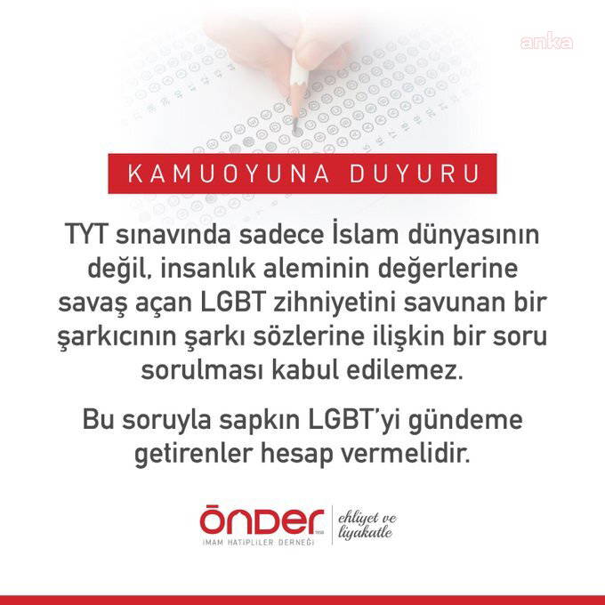 Dernek’ten yapılan açıklamada, “YTY sınavında sadece İslam dünyasının değil, insanlık aleminin değerlerine savaş açan LGBT zihniyetini savunan bir şarkıcının şarkı sözlerine ilişkin bir soru sorulması kabul edilemez. Bu soruyla sapkın LGBT’yi gündeme getirenler hesap vermelidir” denildi.