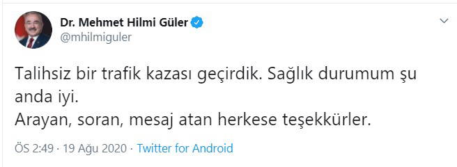 Güler, Twitter hesabından "Talihsiz bir trafik kazası geçirdik. Sağlık durumum şu anda iyi. Arayan, soran, mesaj atan herkese teşekkürler." açıklamasını yaptı.