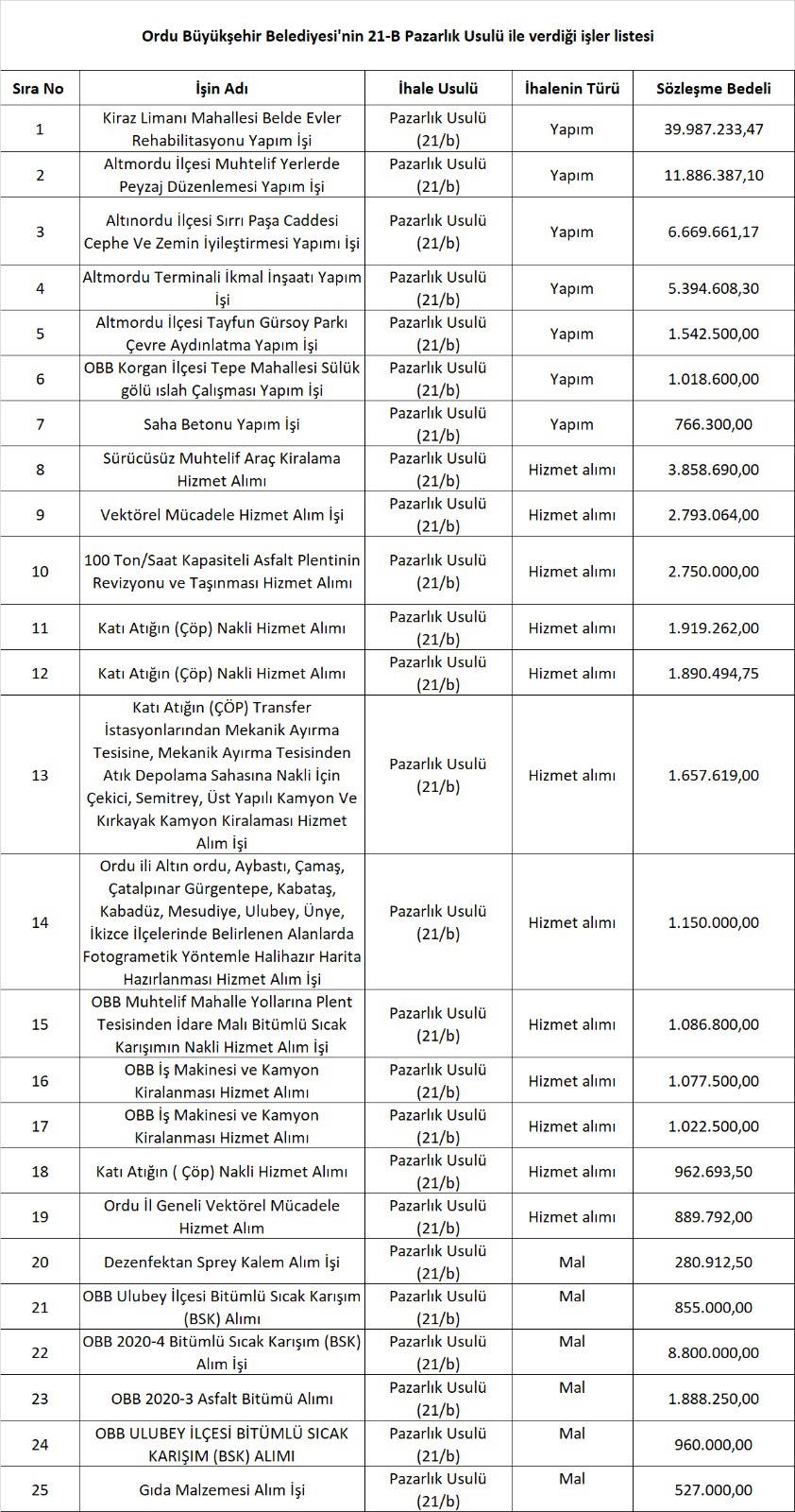 CHP Ordu Milletvekili Mustafa Adıgüzel, AKP'li Ordu Büyükşehir Belediyesi'nin açık ihale ile yapması gereken 25 ihaleyi sadece olağanüstü hallerde başvurulması gereken 21/B maddesiyle aynı kişiye ait şirketlere verdiğini öne sürdü.