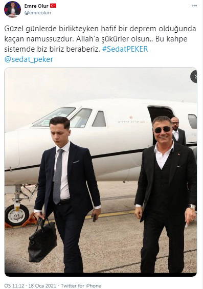 Olur, Twitter hesabından Peker'le bir fotoğrafını paylaşıp "Güzel günlerde birlikteyken hafif bir deprem olduğunda kaçan namussuzdur. Allah’a şükürler olsun.. Bu kahpe sistemde biz biriz beraberiz" diye yazdı.