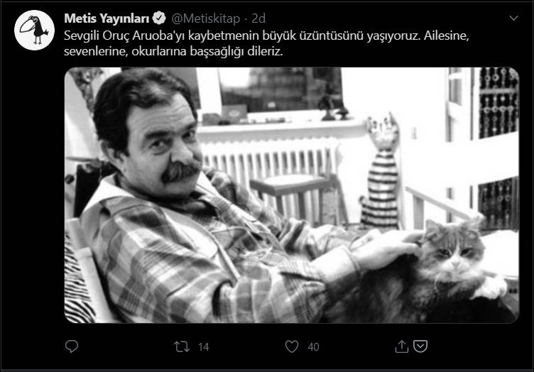 Metis Yayınları: “Sevgili Oruç Aruoba'yı kaybetmenin büyük üzüntüsünü yaşıyoruz. Ailesine, sevenlerine, okurlarına başsağlığı dileriz.”