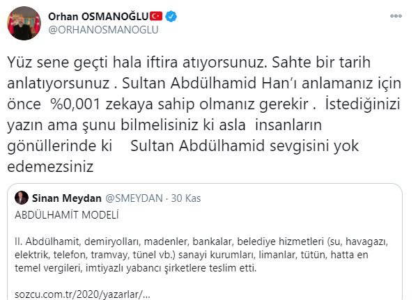 Tarihçi Sinan Meydan’ın 2. Abdülhamit’in demiryollarını, madenleri, bankaları, belediye hizmetlerini yabancı şirketlere devrettiğini belirttiği yazısına Orhan Osmanoğlu sosyal medya üzerinden yanıt verdi.