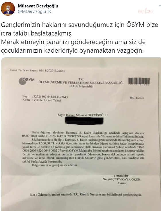"Gençlerimizin haklarını savunduğumuz için ÖSYM bize icra takibi başlatacakmış. Merak etmeyin paranızı göndereceğim ama siz de çocuklarımızın kaderleriyle oynamaktan vazgeçin."