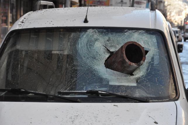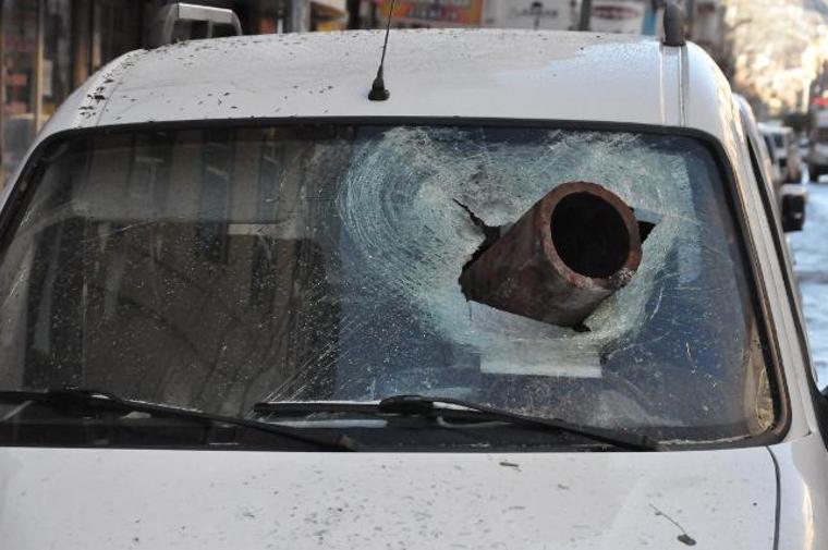 Aracın ön camından giren baca parçası, yoldan geçenleri şaşkınlığa uğrattı.