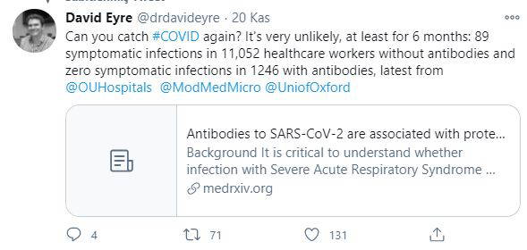Oxford Üniversitesi'nde Bulaşıcı Hastalıklar Profesörü ve araştırma üzerinde çalışan David Eyre, " En azından kısa vadede, COVID-19 olan çoğu insanın tekrar olmayacağından emin olabiliriz. Enfeksiyondan korumanın daha uzun sürüp sürmediğini öğrenmek için çalışma devam ediyor" dedi.