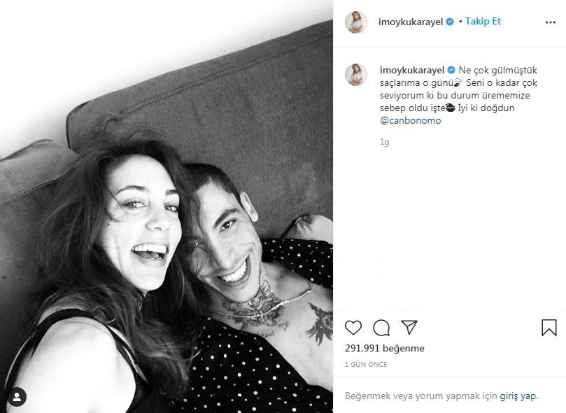 Birlikte oldukları bir kareyi paylaşan Karayel, "Ne çok gülmüştük saçlarıma o gün... Seni o kadar çok seviyorum ki bu durum ürememize sebep oldu işte... İyi ki doğdun..." notunu düştü.