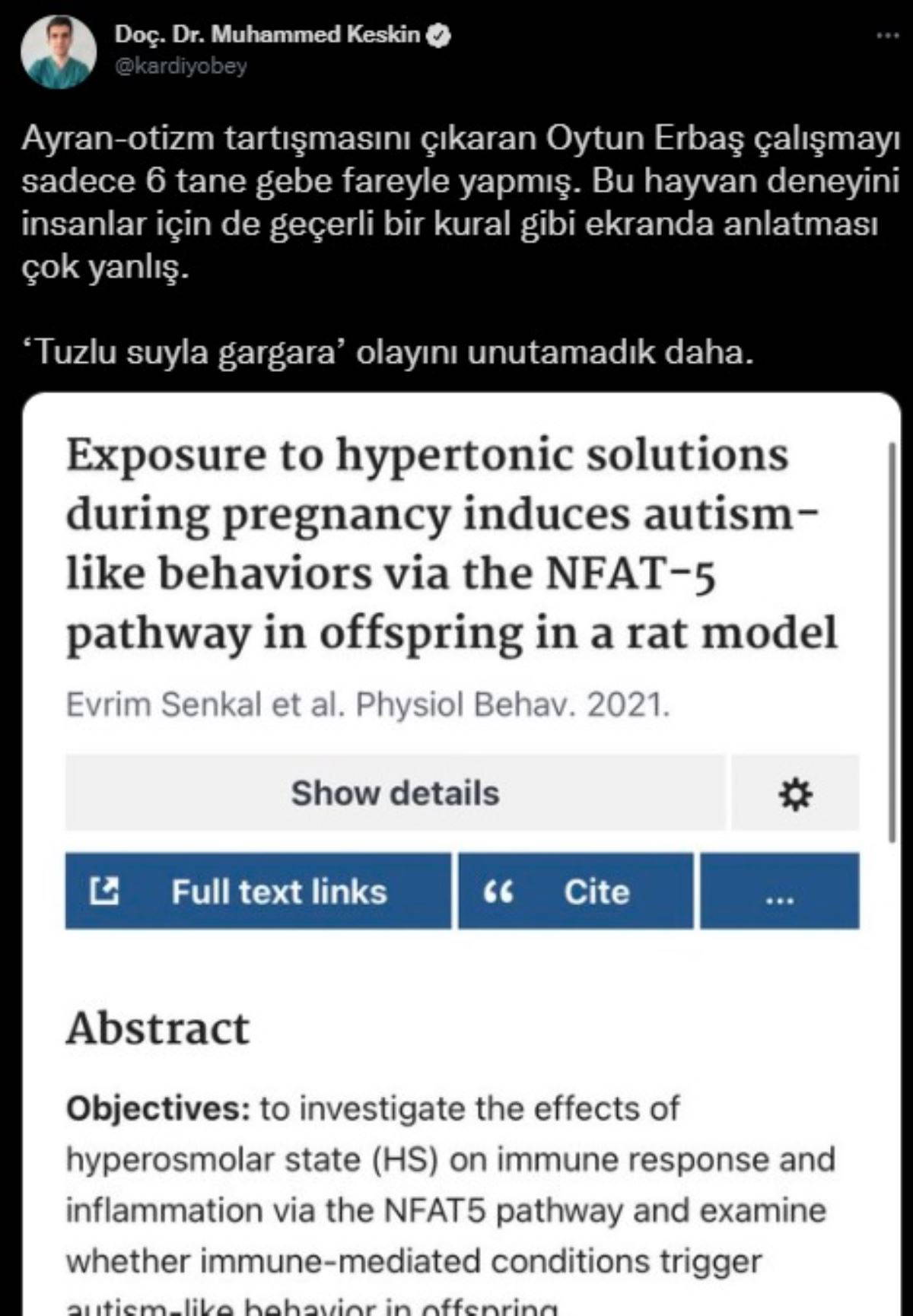 Erbaş'ın açıklamalarının gündem olmasının ardından sosyal medyadan tepki geldi. Erbaş'a tepki gösteren doktor ve akademisyenler, söz konusu iddianın sıçanlar ve fareler üzerinde yapılan bir deneye dayandığı ancak insanlarda nasıl etki yaptığına dair herhangi bir verinin bulunmadığını belirtti.