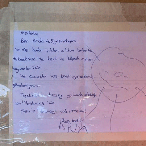 Hazırlanan kolilerden birinin üzerine, 4,5 yaşındaki Arda isimli bir çocuğun yazdığı not görenleri duygulandırdı. Yangın mağduru çocuklar için oyuncaklarını, kedi köpekler için ise mama gönderen Arda, notuna "Size kafa ışıkları aldım. Kafanıza takmak için. Ve kedi ve köpek maması hayvanlar için. Ve çocuklar için kendi oyuncaklarımı gönderiyorum. Teşekkürler her şey yolunda olduğu için" ifadelerini yazdı.