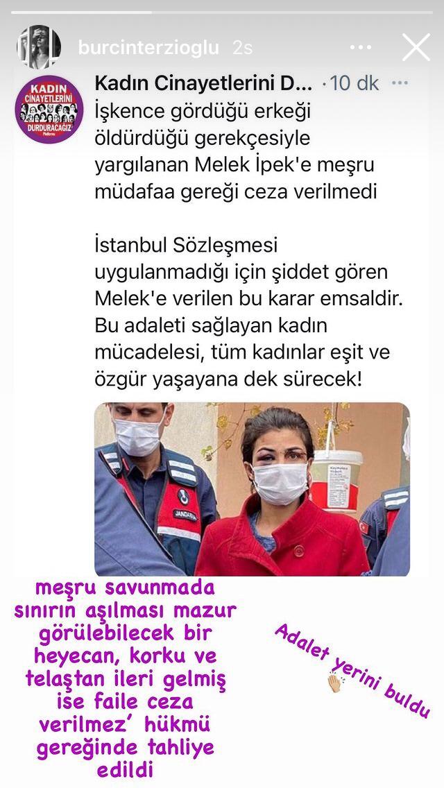 Birçok kadın örgütü, ünlü isim ve sanatçı, Melek İpek'e destek mesajı paylaştı. Oyuncu Burçin Terzioğlu da sosyal medya hesabından Melek İpek için bir paylaşım yaptı.
