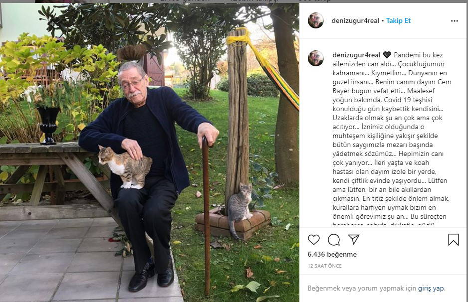 Dayısı Cem Bayer’in fotoğrafını Instagram’dan paylaşan Deniz Uğur, “Pandemi bu kez ailemizden can aldı. Çocukluğumun kahramanı. Kıymetlim. Dünyanın en güzel insanı… Benim canım dayım Cem Bayer bugün vefat etti. Maalesef yoğun bakımda, Kovid 19 teşhisi konulduğu gün kaybettik kendisini. Uzaklarda olmak şu an çok ama çok acıtıyor. İznimiz olduğunda o muhteşem kişiliğine yakışır şekilde bütün saygımızla mezarı başında yâdetmek sözümüz. Hepimizin canı çok yanıyor… İleri yaşta ve koah hastası olan dayım izole bir yerde, kendi çiftlik evinde yaşıyordu… Lütfen ama lütfen, bir an bile akıllardan çıkmasın. En titiz şekilde önlem almak, kurallara harfiyen uymak bizim en önemli görevimiz şu an… Bu süreçten beraberce, sabırla, dikkatle, güçlü çıkmamızı diliyorum Allah'tan” ifadelerini kullandı.