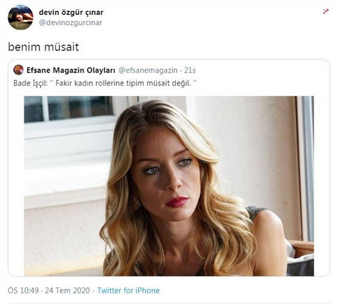 Oyuncu Devin Özgür Çınar da bu tweet’i alıntıladı ve “Benim müsait” yazdı. Ünlü oyuncunun bu tweet’i 11 bini aşkın beğeni aldı.