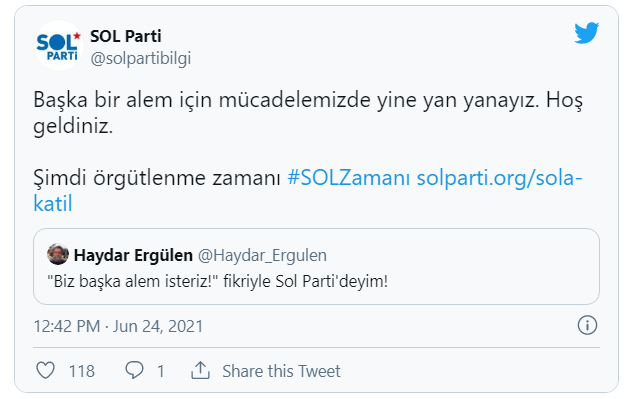 Ergülen, "Biz başka alem isteriz!' fikriyle Sol Parti'deyim!" ifadelerini kullanırken Ergülen'in paylaşımını alıntılayan SOL Parti ise "Başka bir alem için mücadelemizde yine yan yanayız. Hoş geldiniz. Şimdi örgütlenme zamanı" paylaşımı yaptı.