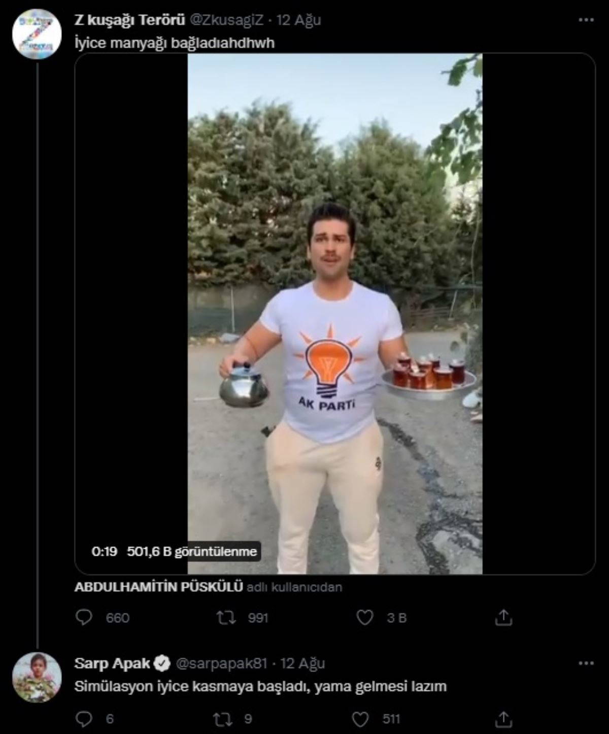 Videoya yönelik eleştiriler sürerken, bir tepki de oyuncu Sarp Apak'tan geldi. Apak, söz konusu videonun altına, "Simülasyon iyice kasmaya başladı, yama gelmesi lazım" yorumunu yaptı.