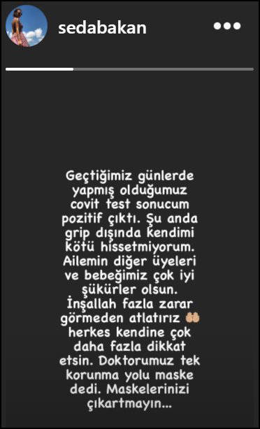 "Geçen günlerde yapmış olduğumuz Covid test sonucum pozitif çıktı. Şu anda grip dışında kendimi kötü hissetmiyorum. Ailemin diğer üyeleri ve bebeğimiz çok iyi şükürler olsun. İnşallah fazla zarar görmeden atlatırız. Herkes kendine çok daha fazla dikkat etsin. Doktorumuz ‘Tek korunma yolu maske’ dedi. Maskelerinizi çıkartmayın."