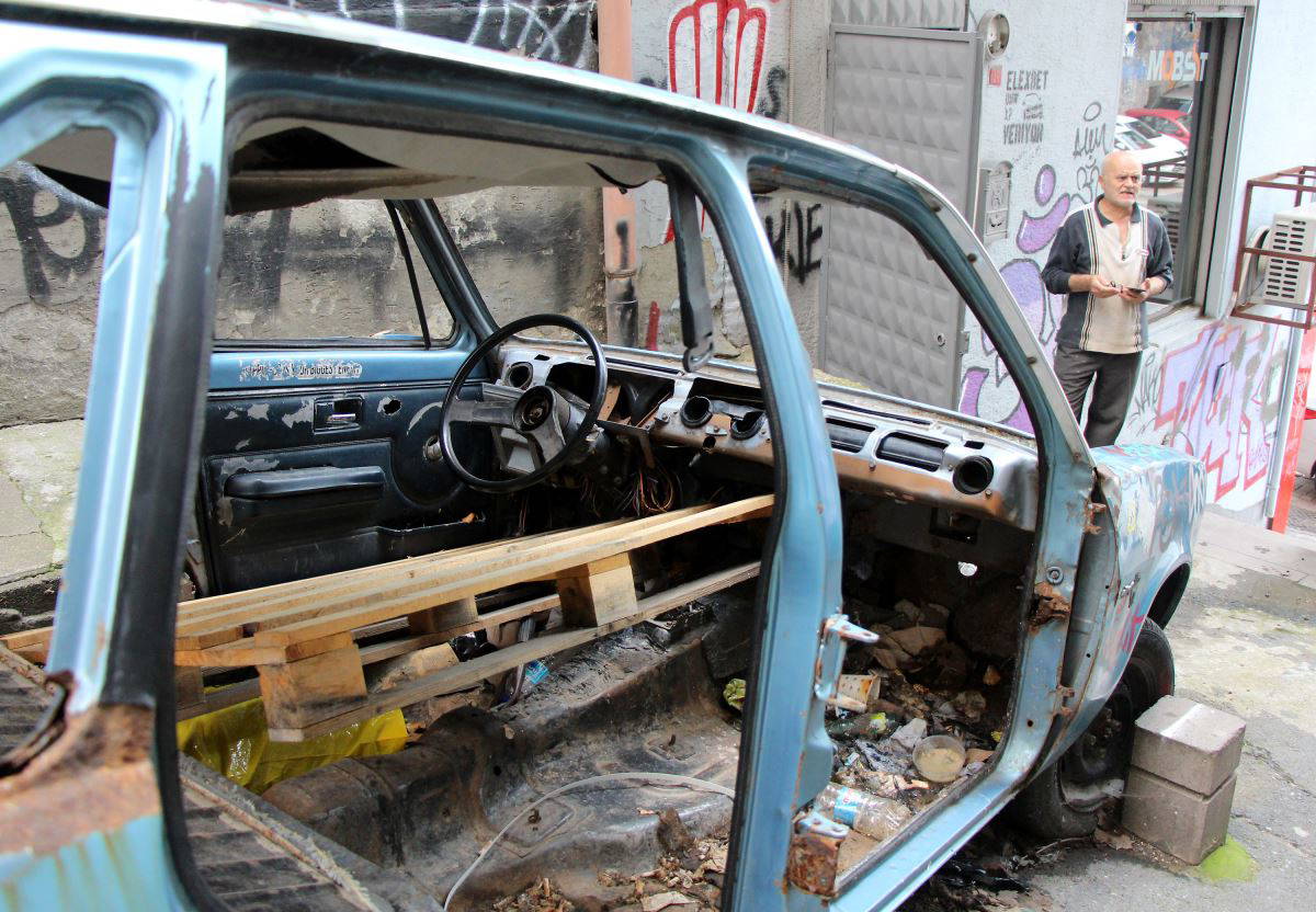 Hurdaya dönen otomobilin kaldırılmasını isteyen esnaf Adem Öztürk,’’ Tophane’den bir arkadaş buraya arabayı bırakıyor. Araba biraz daha yukardaydı. Çalmak isterken buraya kadar inmiş. Araba buraya geldiğinde sağlamdı, temizdi, her şeyi vardı. Bu hale geldi. Biz belediye ya da emniyetten bu arabayı kaldırmalarını istiyoruz. Çünkü içi çöple doldu. Her türlü pislik var. Bizim isteğimiz bu arabanın buradan kaldırılması’’ diye konuştu.