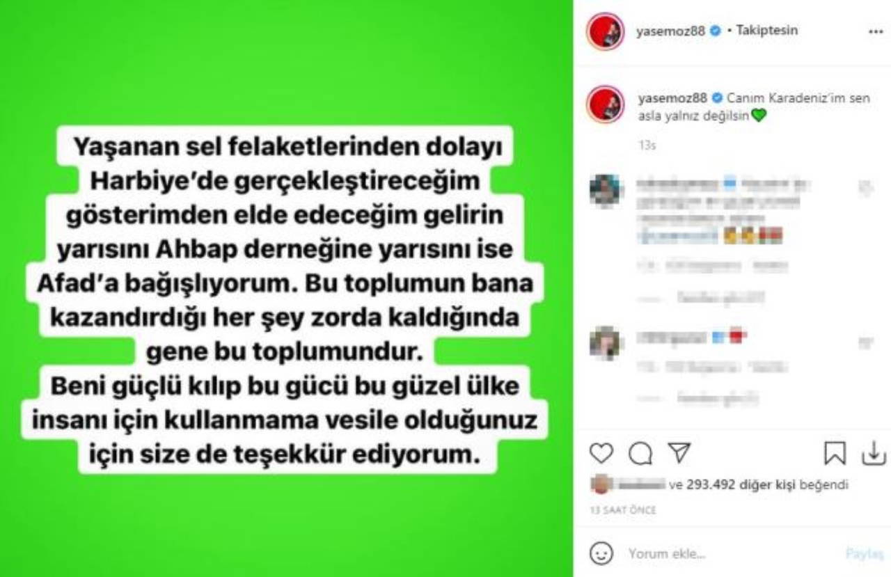 Sosyal medya hesabı Instagram’dan paylaşım yapan Sakallıoğlu, “Yaşanan sel felaketlerinden dolayı Harbiye’de gerçekleştireceğim gösterimde elde edeceğim gelirin yarısını AHBAP Derneği’ne yarısını ise AFAD’a bağışlıyorum. Bu toplumun bana kazandırdığı her şey zorda kaldığında gene bu toplumundur. Beni güçlü kılıp bu gücü bu güzel ülke insanı için kullanmama vesile olduğunuz için size de teşekkür ediyorum” dedi.
