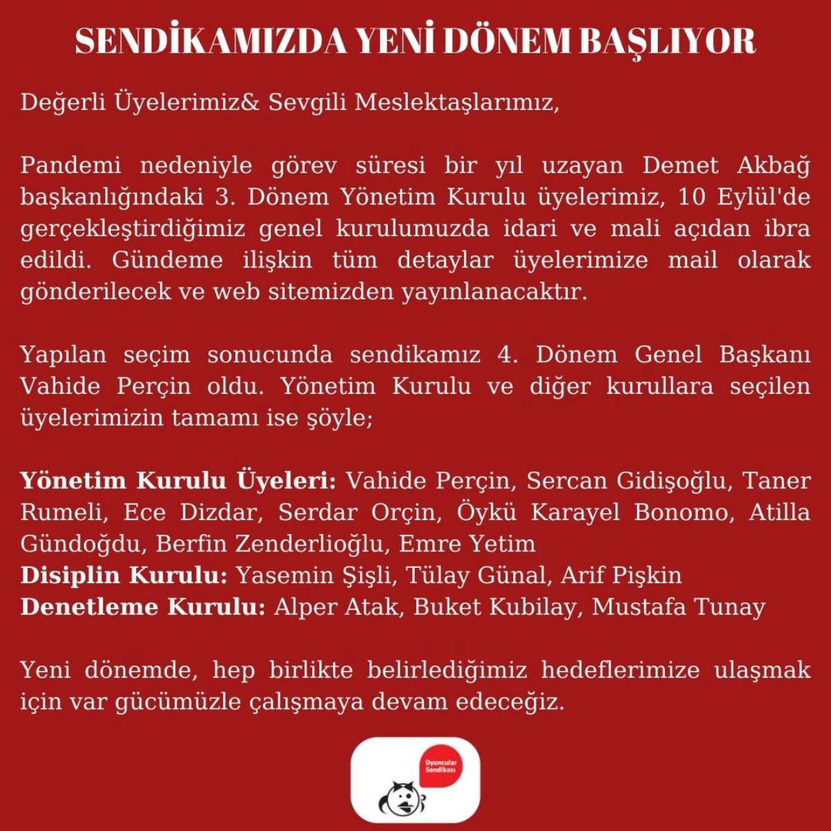 Genel Kurul sonrası oluşan yeni yönetim kurulu, Oyuncular Sendikası'nın resmi Twitter hesabından da duyuruldu.