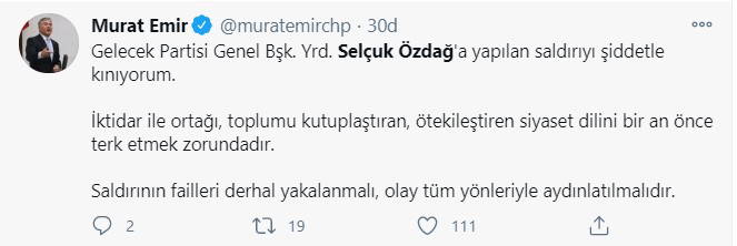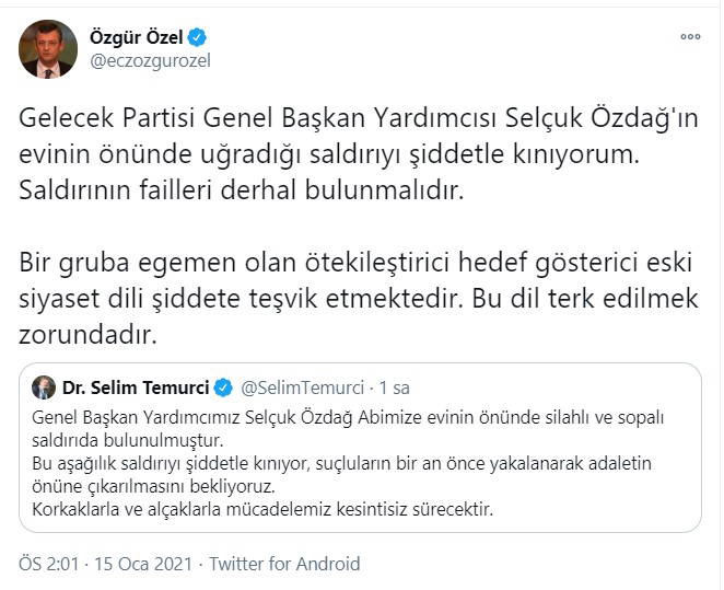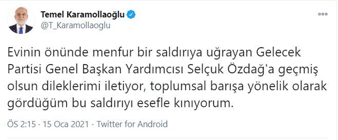 “Evinin önünde menfur bir saldırıya uğrayan Gelecek Partisi Genel Başkan Yardımcısı Selçuk Özdağ'a geçmiş olsun dileklerimi iletiyor, toplumsal barışa yönelik olarak gördüğüm bu saldırıyı esefle kınıyorum.”