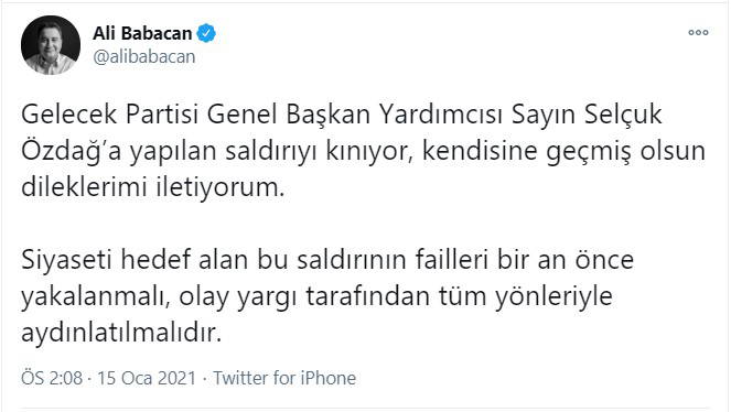 “Gelecek Partisi Genel Başkan Yardımcısı Sayın Selçuk Özdağ’a yapılan saldırıyı kınıyor, kendisine geçmiş olsun dileklerimi iletiyorum. Siyaseti hedef alan bu saldırının failleri bir an önce yakalanmalı, olay yargı tarafından tüm yönleriyle aydınlatılmalıdır.”