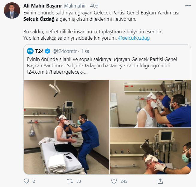 “Değerli dostum Manisa eski milletvekili ve halen Gelecek Partisi Genel Başkan Yardımcısı Selçuk Özdağ’ın cuma namazına giderken evinin önünde silahlı ve sopalı saldırıya uğramasından büyük üzüntü ve endişe duydum. Sayın Özdağ başından ve kollarından ciddi yaralar almıştır. Halen hastane acil serviste tedavisi devam etmektedir. Kendisine ve ailesine geçmiş olsun dileklerimi iletiyorum. Rabbim acil şifalar versin.