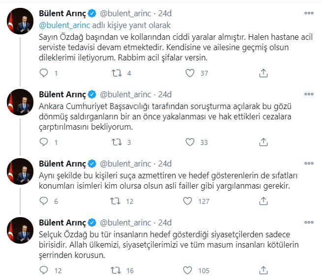 Eski TBMM Başkanı Bülent Arınç Twitter hesabından yaptığı paylaşımla, Selçuk Özdağ’ın uğradığı saldırıdan büyük üzüntü ve endişe duyduğunu dile getirdi.