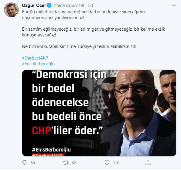 Berberoğlu ve 2 HDP'li ismin milletvekilliğinin düşürülmesini sert sözlerle eleştiren Özel Twitter adresinden yaptığı açıklamada, "Bugün millet iradesine yaptığınız darbe nedeniyle sineceğimizi düşünüyorsanız yanılıyorsunuz!" ifadelerini kullandı.