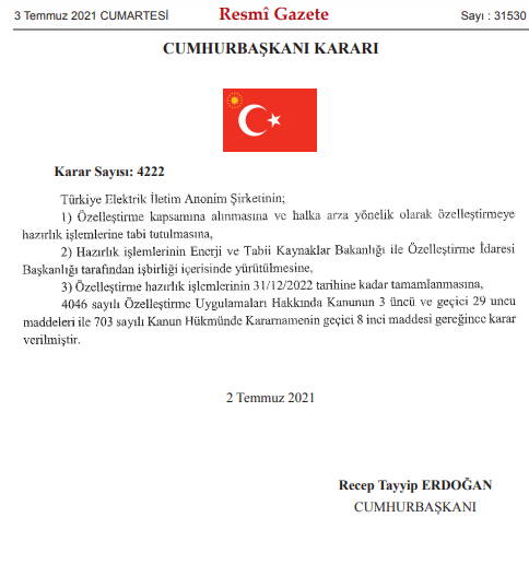 Konuya ilişkin Cumhurbaşkanlığı Kararı Resmi Gazete'nin bugünkü sayısında yayımlandı. Buna göre, TEİAŞ'ın özelleştirme kapsamına alınmasına ve halka arza yönelik olarak özelleştirmeye hazırlık işlemlerine tabi tutulmasına 703 sayılı Kanun Hükmünde Kararnamenin ilgili maddesi gereğince karar verildi.
