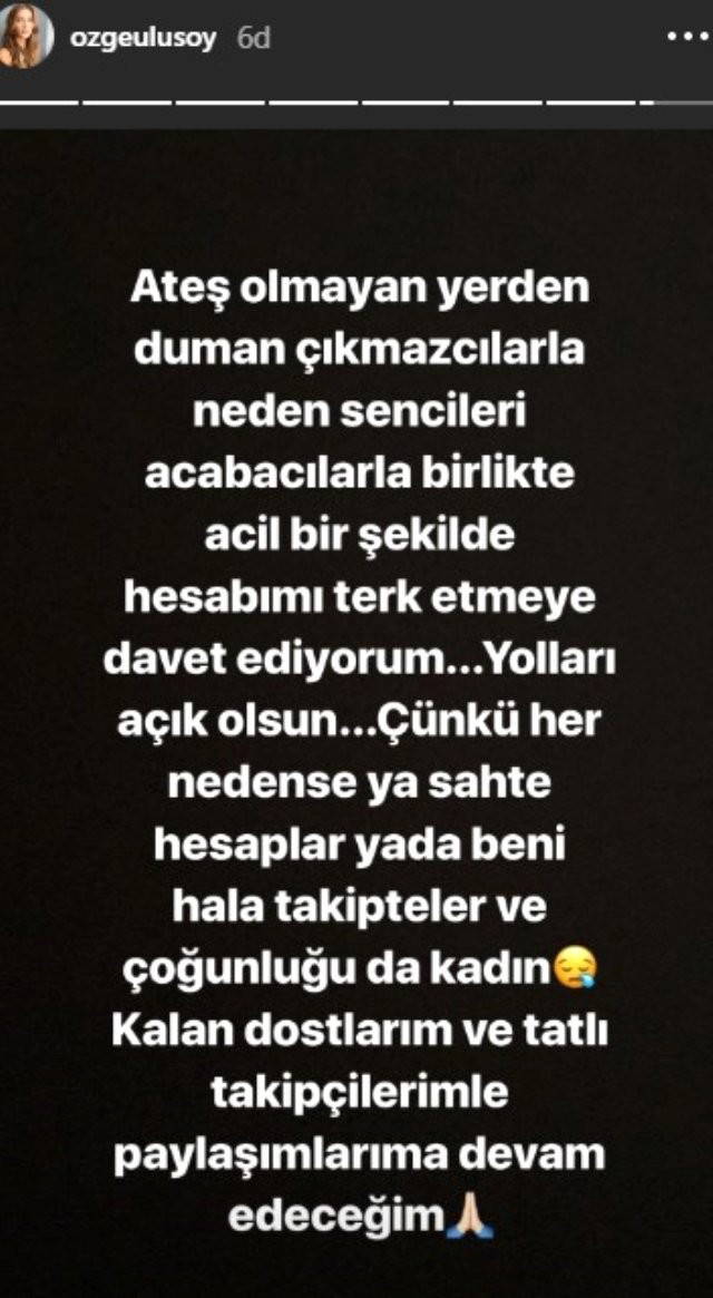 "Ateş olmayan yerden duman çıkmazcılarla neden sencileri acabacıları, birlikte acil bir şekilde hesabımı terk etmeye davet ediyorum… Yolları açık olsun. Çünkü her nedense ya sahte hesap ya da beni hâlâ takipteler ve çoğunluğu da kadın. Kalan dostlarım ve tatlı takipçilerimle paylaşımlarıma devam edeceğim."
