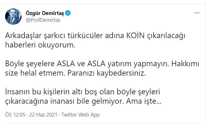 Sosyal medya hesabından, ‘’Arkadaşlar şarkıcı türkücüler adına koin çıkarılacağı haberleri okuyorum. Böyle şeylere asla ve asla yatırım yapmayın. Hakkımı size helal etmem. Paranızı kaybedersiniz. İnsanın bu kişilerin altı boş olan böyle şeyleri çıkaracağına inanası bile gelmiyor. Ama işte'’ açıklamasında bulunan Demirtaş, Emrah’a tepki gösterdi.