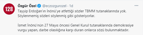 Özel, "İsmet İnönü’nün 27 Mayıs öncesi Genel Kurul tutanaklarında demokrasiye vurgu yapan, darbe olasılığına karşı duran onlarca sözü bulunmaktadır" diye yazdı.