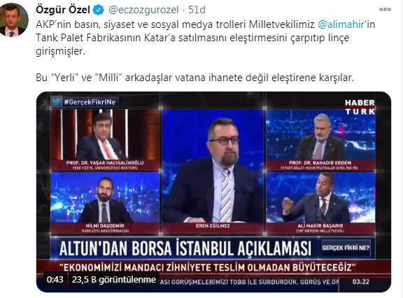 CHP Grup Başkanvekili Özgür Özel, Tank Palet Fabrikası'nın özelleştirilip Katar ortaklığına devrine karşı çıkan CHP Mersin Milletvekili Ali Mahir Başarır'ın AKP, yandaş ve trol ordusu tarafından hedef gösterilmesinin ardından açıklama yaptı.